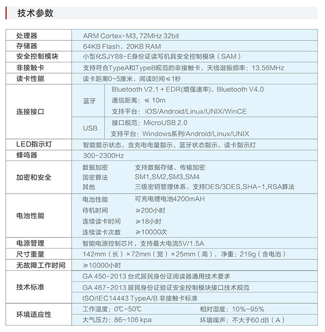 IDR240產(chǎn)品內(nèi)置公安部授權(quán)的小型化SJYY88-E身份證讀寫(xiě)機(jī)具安全控制模塊(SAM)和藍(lán)牙模塊,可讀取居民身份證信息,通過(guò)藍(lán)牙或USB接口上傳到計(jì)算機(jī)進(jìn)行解碼,實(shí)現(xiàn)居民身份證的有效性驗(yàn)證、存儲(chǔ)、查詢和打印,支持核查名單提示??蓪?duì)接各類業(yè)務(wù)系統(tǒng),可兼容讀寫(xiě)其他行業(yè)定制的基于TypeA、TypeB規(guī)范的行業(yè)非接觸卡。內(nèi)置大容量高能鋰電池,支持快速充電,智能電源管理提升續(xù)航能力。